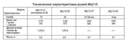 Существует четыре модификации ружья МЦ110: под патрон 12х70 - МЦ110-12 (исполн. А), МЦ110-12 (исполн. Б) и под патроны 20х70 - МЦ110-20, МЦ110-07 и МЦ110-09. Модели МЦ110-12 (исполн. А и Б). Модификации отличаются методом изготовления планки: ружьё А оснащается планкой, с применением гибки и пайки, в ружье Б - планка изготавливается резанием.