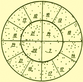 Площадь цели такого размера пять раз накладывается на площадь одной доли мишени, которая, как вы помните, равна 276 см2 (276 : 55 = 5). Для поражения целей такого размера достаточно попадания трех дробинок № 7. Следовательно, для того чтобы в каждом месте нашей мишени цель была надежно поражена, нужно, чтобы в каждую долю мишени попало 5 х 3 = 15 дробинок. Конечно, практически нужно иметь несколько большую плотность дробовой осыпи, так как дробь неравномерно распределяется по площади каждой доли. При создании патронов это учитывается и, как правило, в снаряде содержится больше дробинок, чем их необходимо для поражения на нормальные дальности стрельбы по теоретическим расчетам. Теоретически достаточно 240 дробинок (15 дробинок х 16 долей) на всю площадь мишени, чтобы при хорошем качестве осыпи цели размером в 55 см2 поражались надежно. У нас получилось 250 дробинок в мишени, то есть несколько больше необходимой теоретической плотности дробовой осыпи. Однако мы видим, что и этого мало. В самом деле, посмотрите на рисунок: в центральном круге мишени одна доля имеет только 7 дробинок, во внешнем кольце есть доли с 10, 12 и 13 дробинками, еще три доли имеют по 14 дробинок, то есть все эти доли имеют менее 15 дробинок, необходимых для надежного поражения целей с площадью поражения 55 см2. Даже при правильном накрытии цели дробовой осыпью мы можем иметь и подранков и даже - чистые промахи. А это значит, что стрелять по целям такого размера - даже на 35 м - можно только в расчете на удачу.