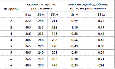 Последние исследования американских испытательных станций, проведенные с использованием хронографов и киносъемки, показали, что фактические остаточные скорости и энергия поражения дробинок оказались несколько выше, чем это определялось ранее расчетным путем. Эти же замеры подтвердили, что энергии дробинок с минимальными и максимальными начальными скоростями на предельных дальностях стрельбы отличаются лишь вторым, после запятой, знаком, иначе говоря, их энергии практически одинаковы (см. табл.)