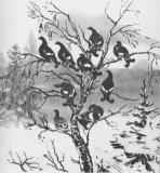 Я все ждал подлета тетеревов к шалашу, но они теперь уже бормотали вдали/ И снова через несколько минут их песня оборвалась. Послышался шум летевших птиц, и вскоре почти рядом с шалашом опустились на землю четыре петуха. Я не шевелился и ждал, когда птицы забормочут. Вскоре один петух, вытянув вверх шею, крикнул: чувшь! Затем взвился столбом и отпрыгнул в сторону, как бы чем-то недовольный.