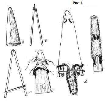 Рис.1. Правилки для пушнины: А - клиновидная; 6 - вильчатая, В - раздвижная, Г - посадка шкурки, снятой трубкой, Д - правильно обряженые правилки.