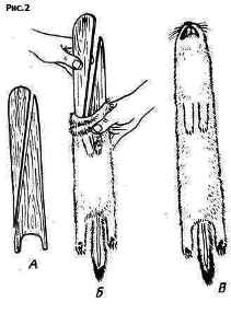 Шкурки, снятые чулком, правят на стандартной правилке. Правилку изготовляют из сухих несмолистых дощечек толщиной не более 0,5 см. В одном конце ее вырезают овал и выпиливают две ножки, суживающиеся к концу. Правилку распиливают по косой линии и распил отстругивают (рис. 2, А). Вначале в ротовое отверстие вводят одну из половин правилки широкой частью, ножкой вперед, пропуская ее через всю полость шкурки. Дере-вянную ножку устанавливают на лапке у коготков, затем вводят вторую половинку узкой стороной и устанавливают ножкой в другой лапке (рис. 2, Б). Совмещенные половинки правилки растягивают шкурку в длину и ширину, расправляют складки кожи (рис. 2, В). Шкурку осаживают руками от хвоста к голове. Правилку следует делать немного длиннее шкурки, чтобы ее было удобнее устанавливать и извлекать во время сушки.