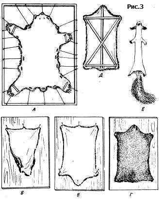 Шкурки мелких зверьков растягивают мехом вниз на ровной доске или щите. Вначале прибивают к доске огузочные углы (рис. 3, Б), затем, равномерно растягивая верхние углы шкурки в обе стороны, прибивают их к доске. Последним вытягивают нос и также крепят его гвоздем (рис. 3, В). Сухая шкурка должна иметь вид прямоугольника с отношением сторон 2:3 (рис. 3, Г). В степных районах шкуры грызунов, снятых пластом (пластиной), правят распорками из камышинок или тонкой лучины, укрепленными в боковых складках кожи (рис. 3, Д). Шкурки белок чаще сушат нерасправленными - комом" (рис. 3, Е).