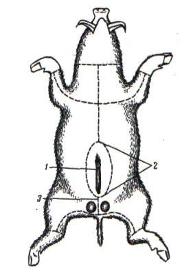 При вскрытии брюшной полости удаление мочеполового аппарата надо производить осторожно, без нарушения целостности семенников, добавочных половых, пузырьковидной, предстательной, бульбоуретральной желез и мочевого пузыря, т. е. тех органов, содержимое которых участвует в образовании неприятного запаха.
